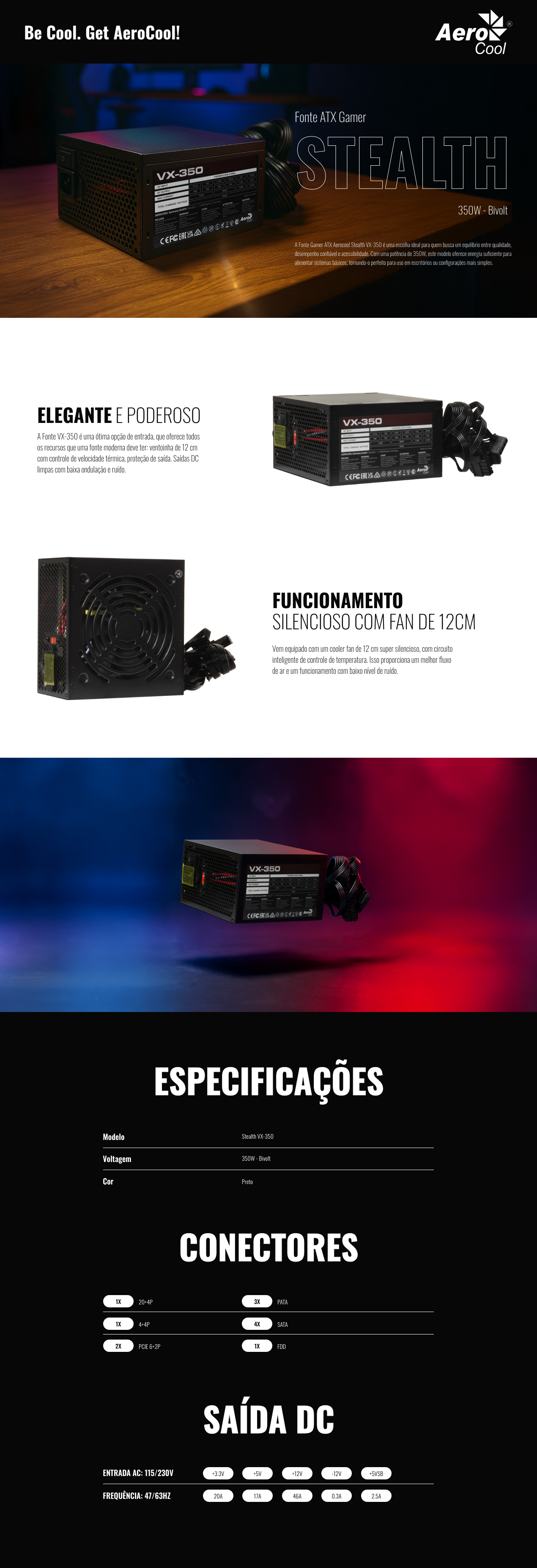 A Fonte Gamer ATX Aerocool Stealth VX-350 é uma escolha ideal para quem busca um equilíbrio entre qualidade, desempenho confiável e acessibilidade. Com uma potência de 350W, este modelo oferece energia suficiente para alimentar sistemas básicos, tornando-o perfeito para uso em escritórios ou configurações mais simples.