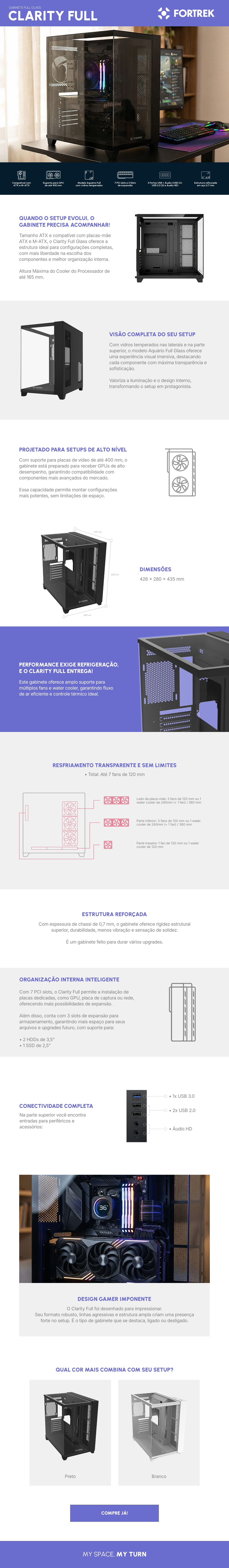 Se você procura um gabinete gamer aquário com vidro temperado ou um gabinete com suporte para GPU de até 400 mm, o Fortrek Clarity Full é a escolha ideal para unir desempenho, espaço interno e visual sofisticado ao seu setup.