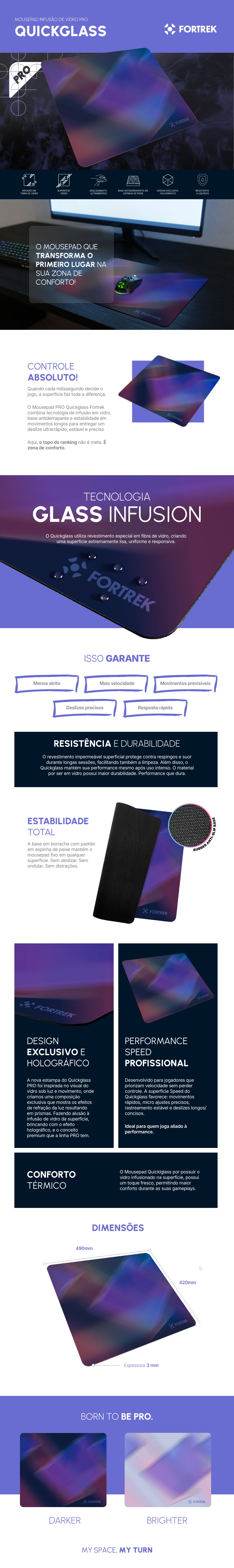 O Mousepad com Infusão de Vidro Quickglass PRO Fortrek foi desenvolvido para gamers que exigem máxima performance, velocidade e precisão em cada movimento. Acreditamos que quando cada milissegundo decide o jogo, a superfície faz toda a diferença.